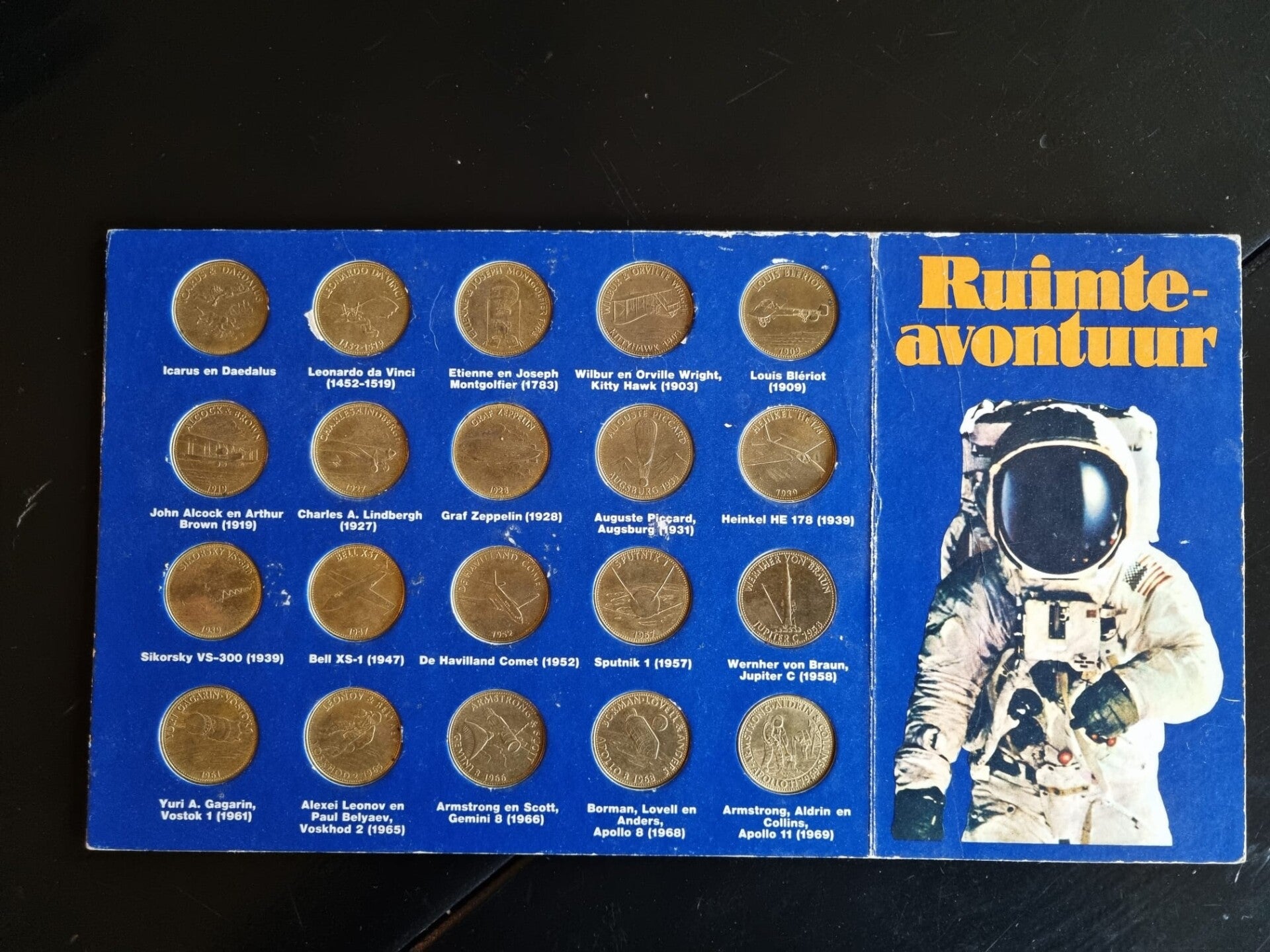 Complete verzameling munten uitgegeven door Shell in 1969 om te sparen met gedenkwaardige gebeurtenissen over de verovering van het luchtruim. Vanaf Icarus tot aan de 1e maanlanding met de Apollo 11 in 1969.