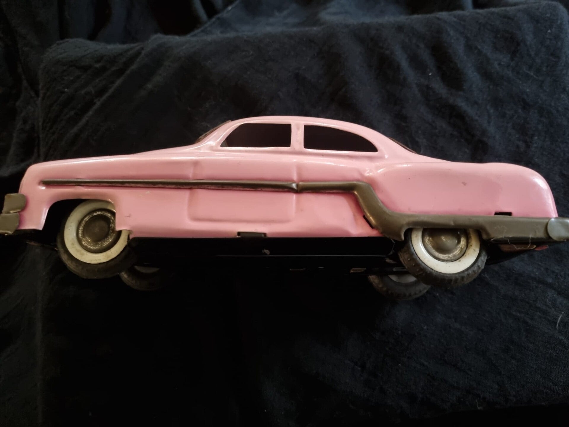 Vintage Blikken speelgoed auto rose pontiac chieftrain uit 1950- 1954 origineel met wieltje voor frictieaandrijving.